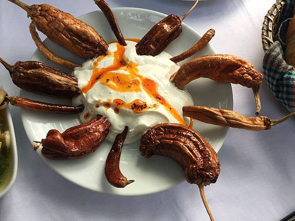 紅辣椒吃來香脆有炭香味, 優格是濃厚的希臘式優格, 淋上一點辣油, 非常特別.