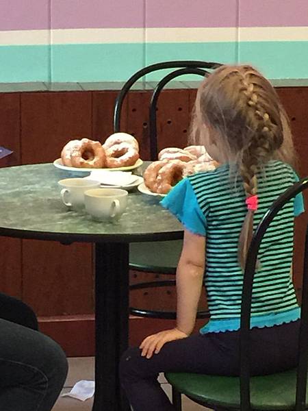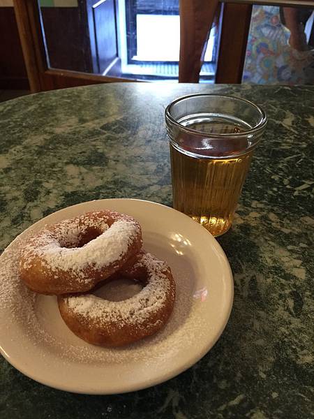甜甜圈就在櫃檯後面的廚房炸好端出, 點好馬上撒上糖粉端上,