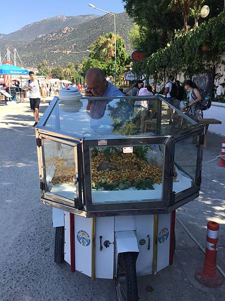 Kas 有許多路邊攤, 熱食冷飲都有, 小推車兜售水煮杏仁,