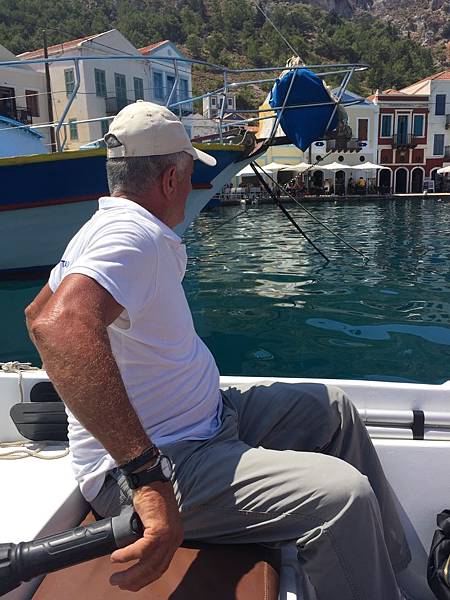 坐上了希臘老船長的小艇, 船上只有我們四人.
